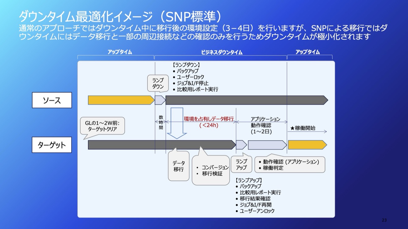 シェルコンバージョンではプロジェクト途中でターゲット環境の設定がすでに完成しているため、ダウンタイム中に必要な作業はデータ移行だけになり、土日の2日間でGo Live(本番環境移行)を完了するプロジェクトも現実的になる。「お客様のIT部門もSIerも、正月やお盆を潰して作業する必要がなくなる」と細谷氏は語る。