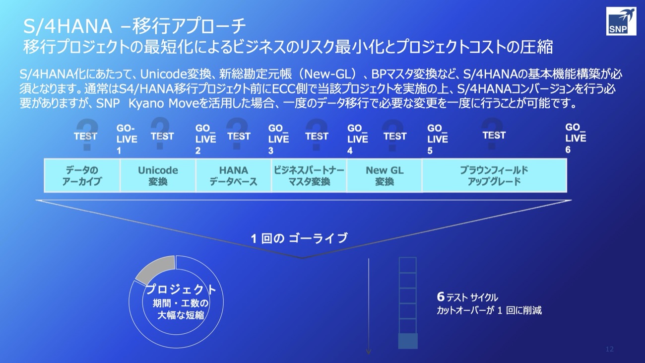 SNP Kyanoを活用するとこれらのデータ変換を移行プロジェクトと一度に完了させられる。「事前プロジェクトを含めて3年6ヵ月の移行スケジュールを計画されていたお客様に、Kyanoを適用することで半分以下の期間でS/4マイグレーションを完了させる提案を行った」と細谷氏は述べる。期間の短縮は総コストの抑制にも直結しており、Kyanoが評価されるポイントの一つになっているという。