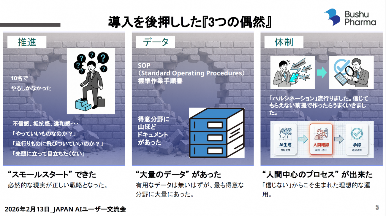 これら3つの壁に直面しながらも、武州製薬のAI導入は一定の成果を上げている。上野氏は、それを「結果論としての3つの偶然があったから」と振り返る。