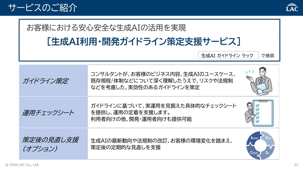 とはいえ、そう簡単に進められるプロセスではないことも事実。そんな企業に対しては、ラックが提供する「生成AI利用・開発ガイドライン策定支援サービス」を利用するのも手だ。同社のコンサルタントが、顧客の事業内容、既存規程、生成AIのユースケースなどを深く理解した上で、リスクや法規制を考慮した実効性あるガイドラインをともに策定してくれる。運用の定着を支援するチェックシートや、法規制・技術動向の変化に応じた定期的な見直し支援もオプションで提供している。