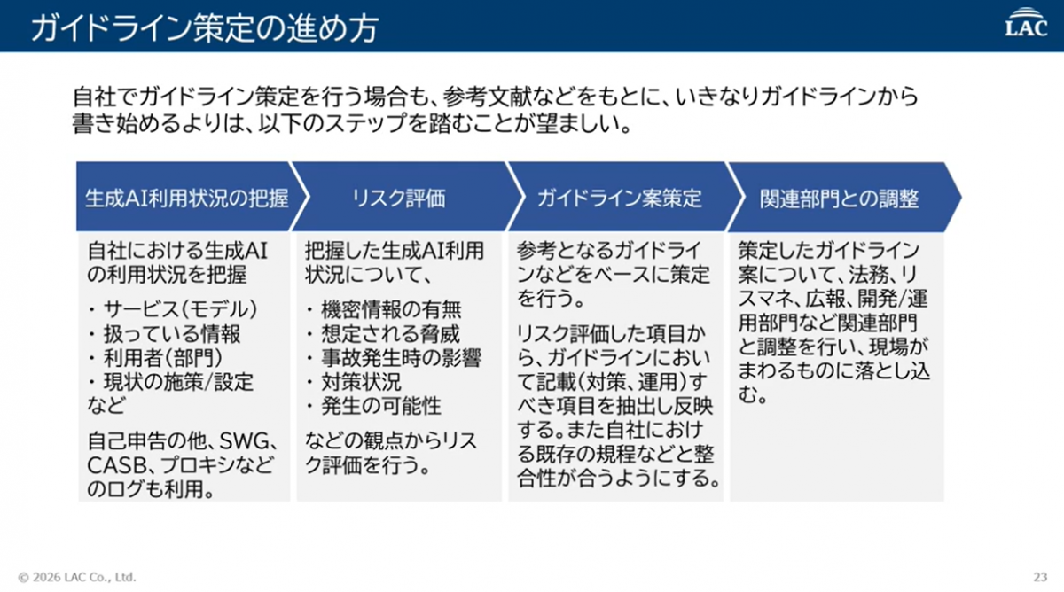 これらを踏まえて、いよいよ実践フェーズに入る。ガイドラインの策定プロセスは、大きく「①利用状況の把握、②リスク評価、③ガイドライン案策定、④関連部門との調整」から成る4つのステップで進めていくのが望ましいとのこと。社内での生成AIの利用状況は、CASBや、社員がどのクラウド/SaaSにアクセスしているか監視するツールのログなども活用して把握しよう。最後の部門調整は、現場で運用可能かつ効力を発揮するガイドラインの仕上げに欠かせない。