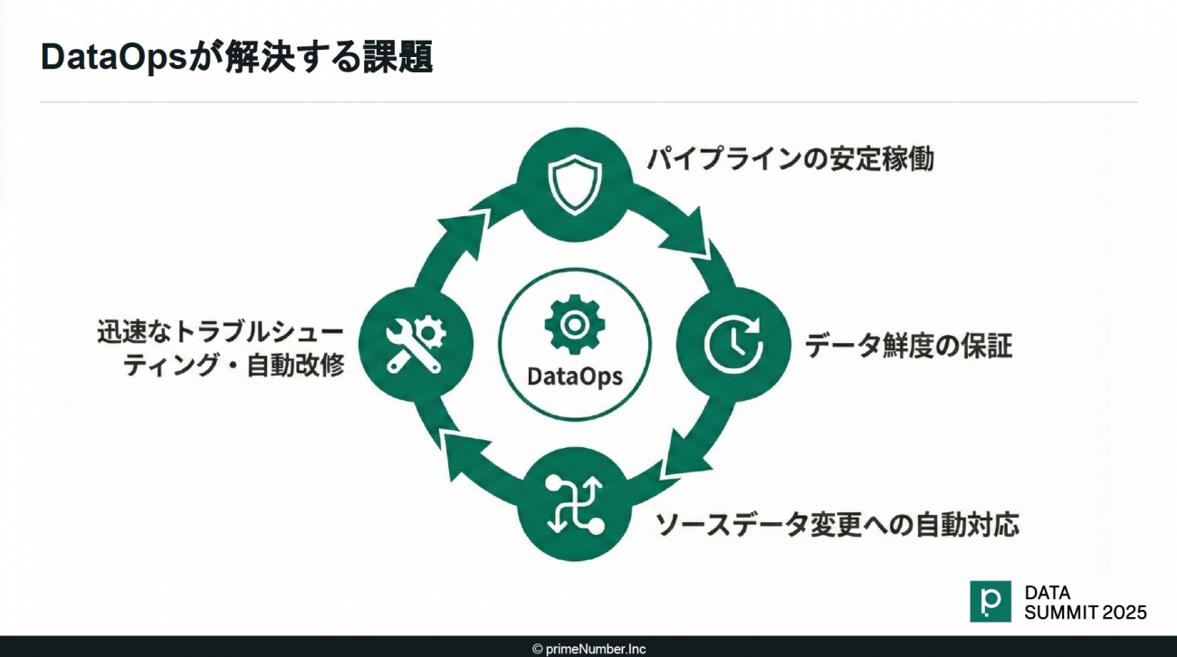 山本氏は「DataOpsを推進することで、エンドユーザーへデータを供給する際に“データの渋滞”を起こしづらくなる。どこかで異常が起きても迅速に復旧が進むため、常に監視する必要がなくなり、運用の負荷から解放されるといった利点もある。また、データ基盤の継続的改善の仕組みが整うことで、専門知識のあるエンジニアが自社にそろっていなくても運用を回せるようになる」と意義を説明した。これをエンドユーザー視点で見れば、データからビジネス成果を得られるスピードの向上が期待できる。当たり前のようにデータを使っていると裏側の努力に気がつく機会がなかなかないが、DataOpsの確立は、ビジネス成果を得るためのエンジンを強化することにつながるのだ。