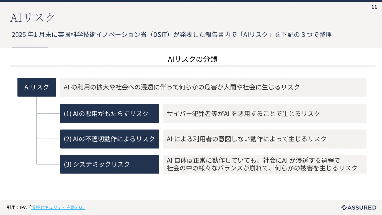 では、AIを取り巻くリスクとは具体的にどのようなものか。情報処理推進機構(IPA)が公表する「情報セキュリティ白書2025」では、英国の科学・イノベーション・技術省(DSIT)の報告書に基づき、AIリスクを以下3つに分類している。