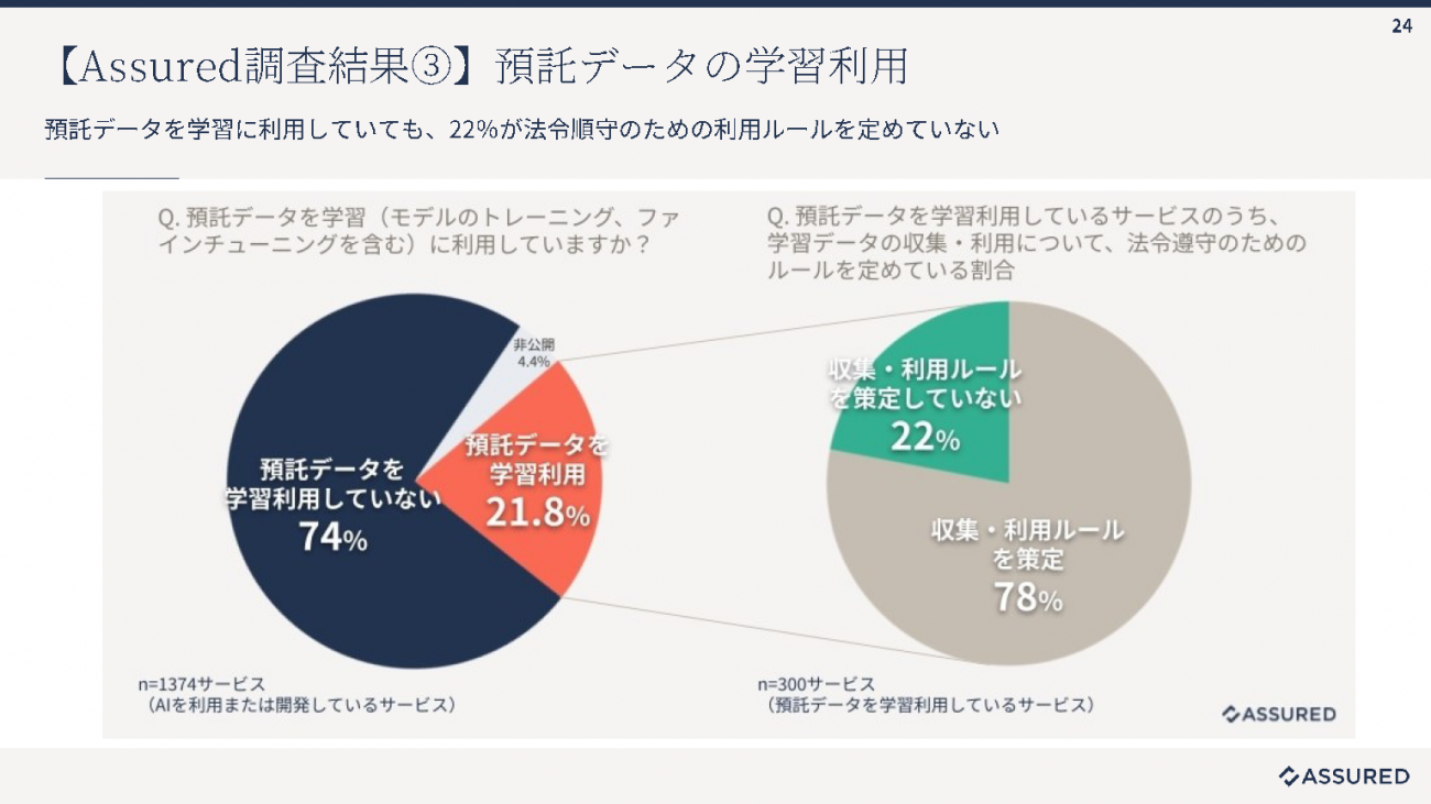 さらに、自社データの扱いも懸念されるポイントだ。AIを利用もしくは開発しているサービスの21.8%が預託データをモデルのトレーニングやファインチューニングに利用しており、そのうち22%は法令遵守のためのルールを定めていないという実態が指摘された。