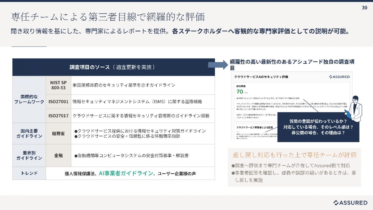Assuredクラウド評価にて提供される評価レポートは、100点満点の総合スコア128項目におよぶリスク評価専門メンバーによるサマリコメントの3要素で構成される。評価項目には「NIST SP 800-53」「ISO27001」「ISO27017」などの国際的なフレームワークをはじめ、総務省のクラウドセキュリティに関する各種ガイドライン、金融庁の「金融機関等コンピュータシステムの安全対策基準・解説書」、AI事業者ガイドラインなどといった国内のトレンドも反映されている。調査から評価まで専任のセキュリティチームが対応し、回答に矛盾や虚偽の疑いがある場合は差し戻しを行うことで、品質を担保する体制が整っている。