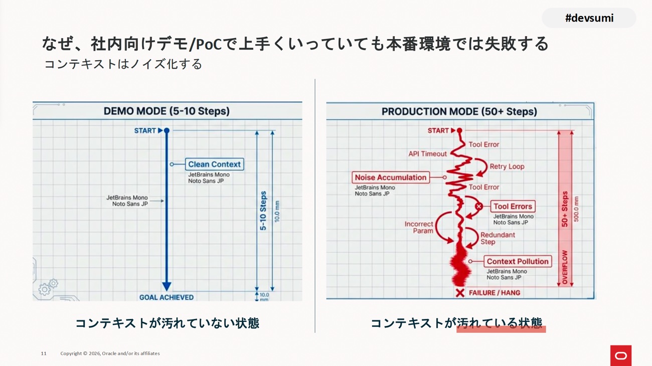 図:PoC(デモ)と本番環境におけるコンテキストの汚れ度合いの違いとノイズ蓄積の原因の可視化|Developers Summit 2026講演「Memory Is All You Need」より(筆者作成) [画像クリックで拡大]