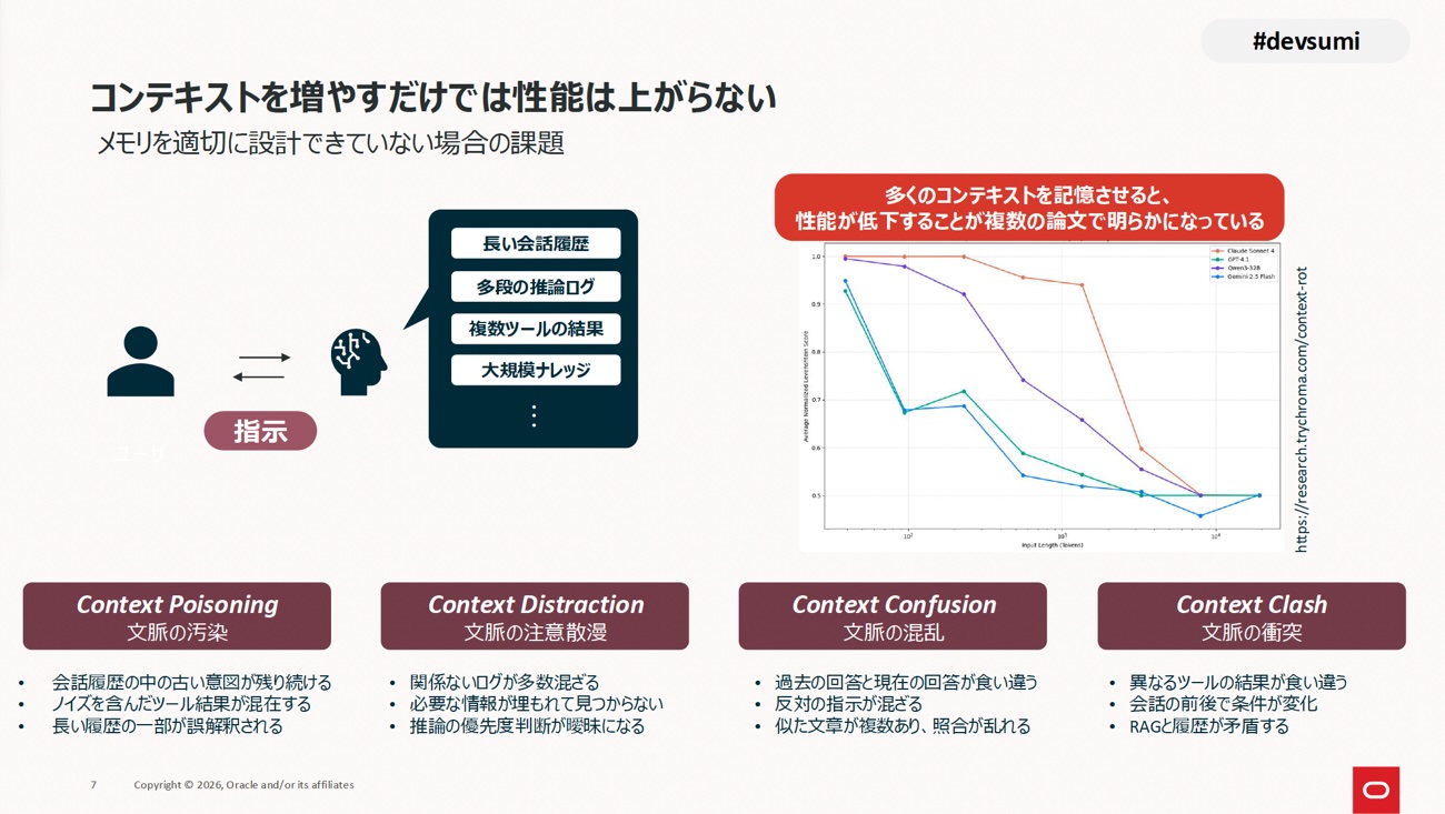 では、なぜ「長いコンテキストを渡せばよい」という発想では足りないのでしょうか。理由は、長い履歴は伸びるほど汚れていくからです。Drew Breunigは2025年、この失敗を整理する実務的な枠組みとして、Context Poisoning、Context Distraction、Context Confusion、Context Clashという4つの類型を提示しました(https://www.dbreunig.com/2025/06/22/how-contexts-fail-and-how-to-fix-them.html)。これは査読論文の標準用語ではありませんが、長時間動くAIエージェントの失敗を説明するには非常に分かりやすい整理です。さらに2026年のLOCA-benchでは、文脈が伸びるほどエージェントの信頼性が落ちる現象を「Context-Rot」と呼んでおり、長文化そのものが新しい課題領域になっていることが分かります(https://arxiv.org/abs/2602.07962)。