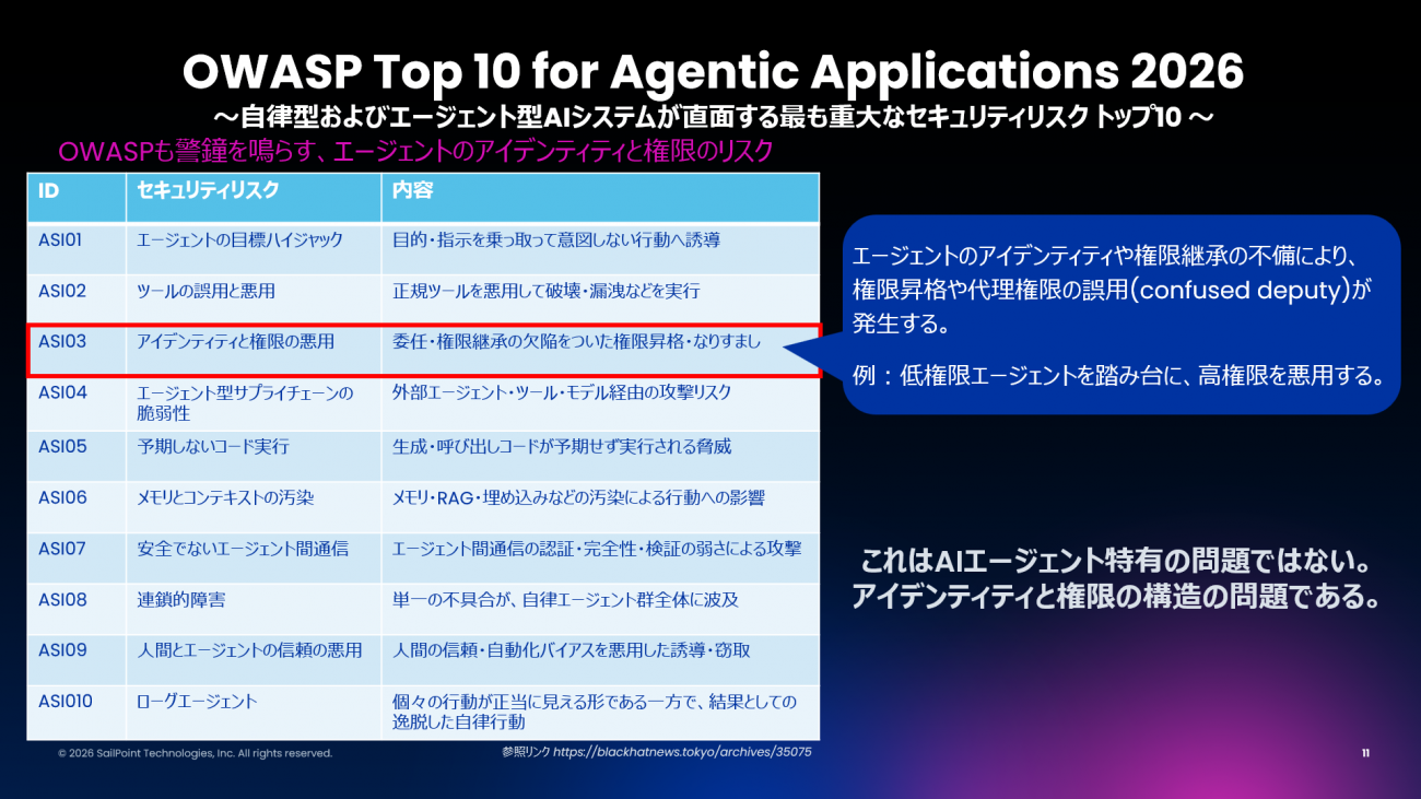 次に、AIのセキュリティリスクについても見ていこう。OWASPが公開している『OWASP Top 10 for Agentic Applications 2026』では、AIエージェントの普及にともなうセキュリティリスクが整理されている。この中で、松本氏が特に注目するのは「アイデンティティと権限の悪用」だ。