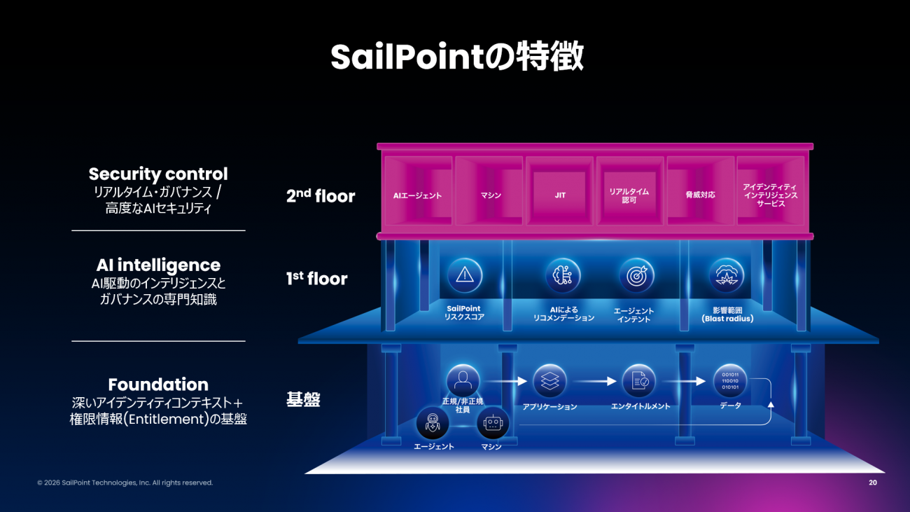基盤の上には、「AI Intelligence」レイヤーが備わっている。ここでは、リスク分析やアクセス権限のレコメンデーションなど、アイデンティティと権限のコンテキストをもとにしたAI分析が行われている。その上にある「Security control」レイヤーでは、AIエージェント保護、JITによる特権管理、リアルタイム認可、アイデンティティ中心の脅威対応を実現する。