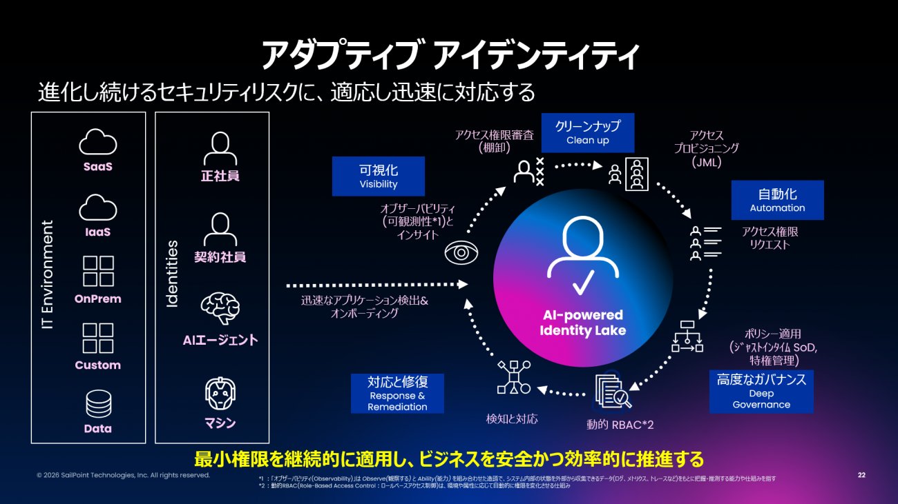 これは、AIと自動化技術を活用し、日々変化する脅威に対してアイデンティティセキュリティを“動的に”最適化していくアプローチを指す。「静的な管理から動的な制御、そしてルールベースからAI・リスクベースへ進化していく必要がある」と同氏は述べた。