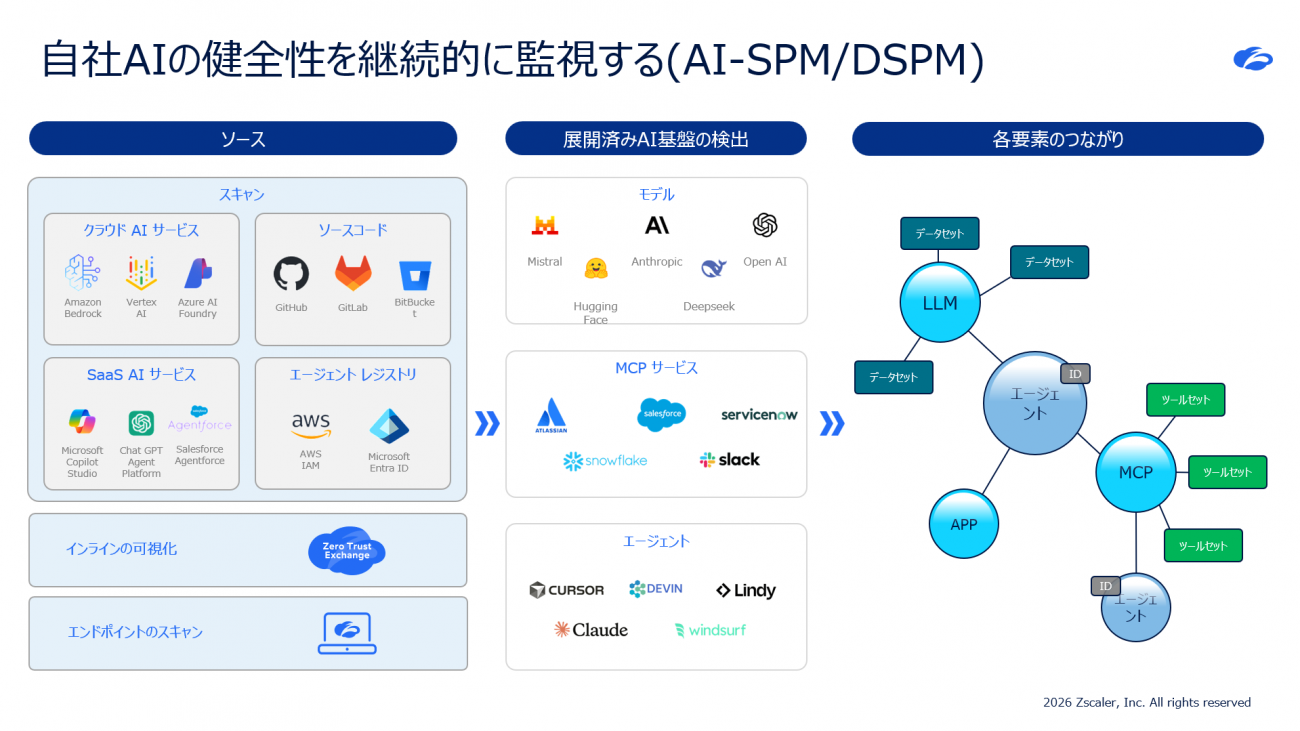 この課題に対して、Zero Trust ExchangeはAPI連携で自動監査する「AI-SPM」機能を提供する。主要なAIサービスやGitHubなどのソースコード管理ツールに接続し、設定ミスや権限の不備を自動的に洗い出す機能だ。使用中のAIモデルや機密情報にアクセス可能なAIエージェントの所在を可視化することも可能であり、機密情報が無防備な場合はリスク値を付与して修復への具体的なガイドラインを提示する。