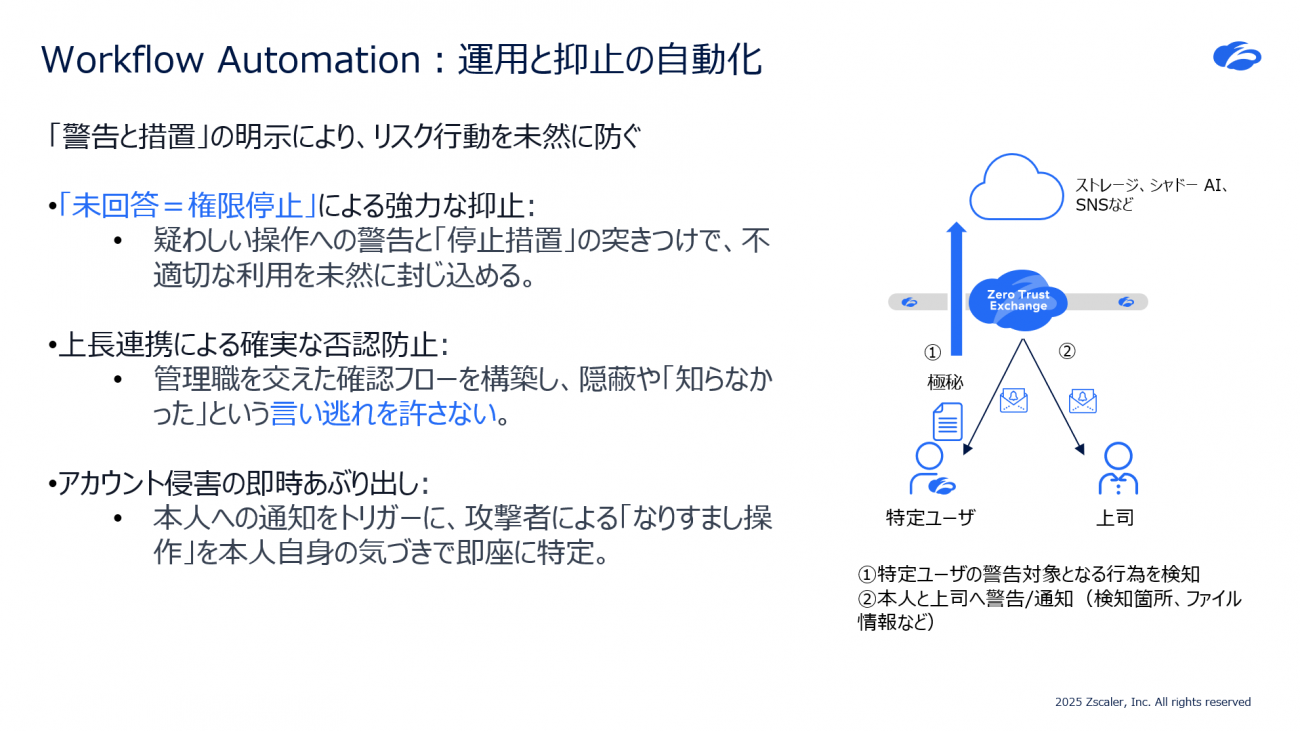 この問題には、動的承認フロー「Zscaler Workflow Automation」で対応できる。これは一律的に業務を制限するのではなく、現場の判断を組み込むことで、機密情報の流出を抑止しつつ必要な業務は止めない運用を実現する仕組みだ。