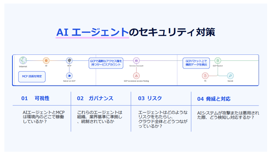 • 可視性:マルチクラウド環境ではログやトレースが分散しやすくなるが、エージェントが動的に行動を変化させることで、追跡の難易度が飛躍的に上がり、インシデントにもつながりやすくなる