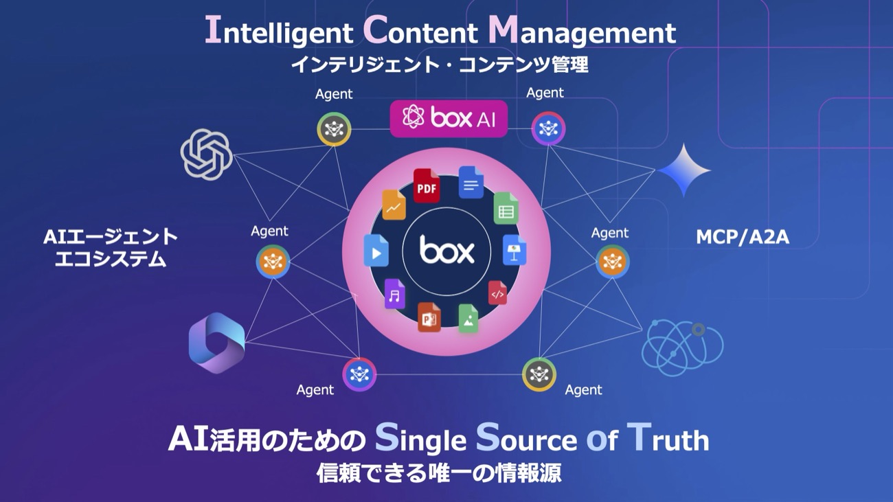 Boxはここ2年半、「インテリジェントコンテンツ管理(ICM:Intelligent Content Management)」というコンセプトのもとで機能を積み上げてきた。カスタムエージェント構築ツール「Box AI Studio」、AIによる機密ラベルの自動付与「Box Shield Pro」、メタデータ自動抽出「Box Extract」、絞り込み検索「Box Apps」──これらはいずれも、AIエージェントが活用しやすいコンテンツ基盤を整えるための施策として位置づけられている。