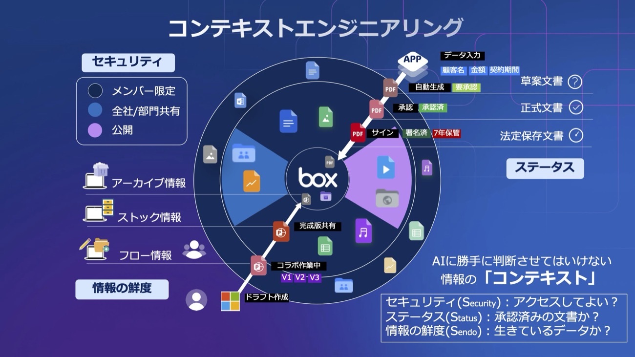 その背景についてBoxのエバンジェリスト・浅見顕祐氏はこう説明する。「企業のコンテンツは適切に管理されていなければ、AIにとってただのノイズになってしまう。セキュリティ、ステータス、情報の鮮度──この3つがコンテキストとして管理されて初めて、AIが正しく使える」。