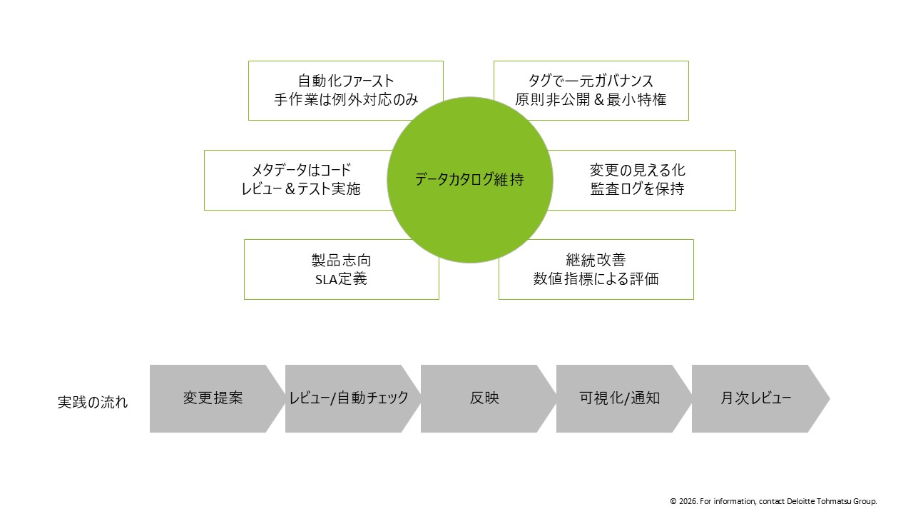 データカタログを長く役立つ状態で保つためには、まず更新作業をできる限り自動化することが重要。手作業での更新は、例外的な対応や緊急時に限るのが基本方針です。