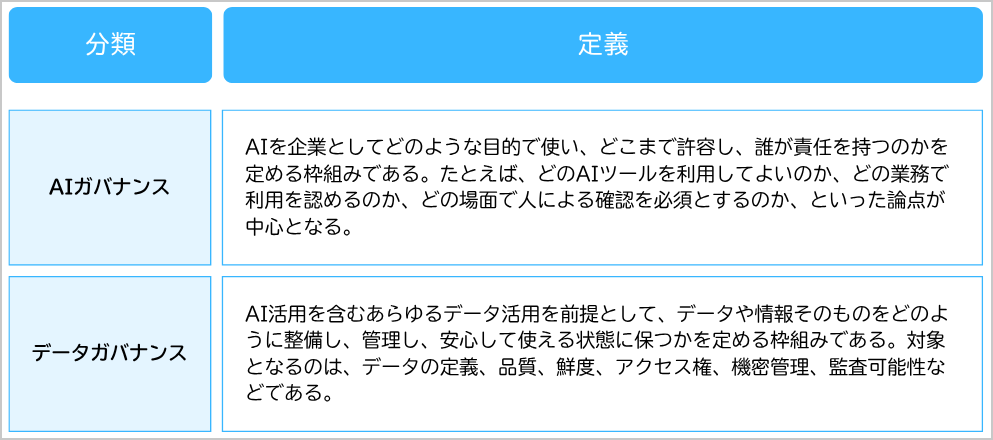 本稿では、データガバナンスを中心に扱うが、実務上の整理としてAIツールやAIの利用そのものに関する統制はAIガバナンスとして、データや情報に関する統制はデータガバナンスとして扱う。