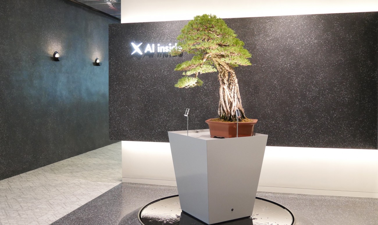 オフィスのコンセプトは「AIと自然の融合」。これは、同社 代表取締役社長の渡久地択氏が考えるAI観と大きく関係しているという。渡久地氏は、AIにおける「どこを切り取り、情報を生成していくか」という視点が、企業価値を高めるために重要だと考えている。その思想は、盆栽の「自然を切り取り、芸術作品として仕上げる」という工程と親和性があるものだと言えよう。