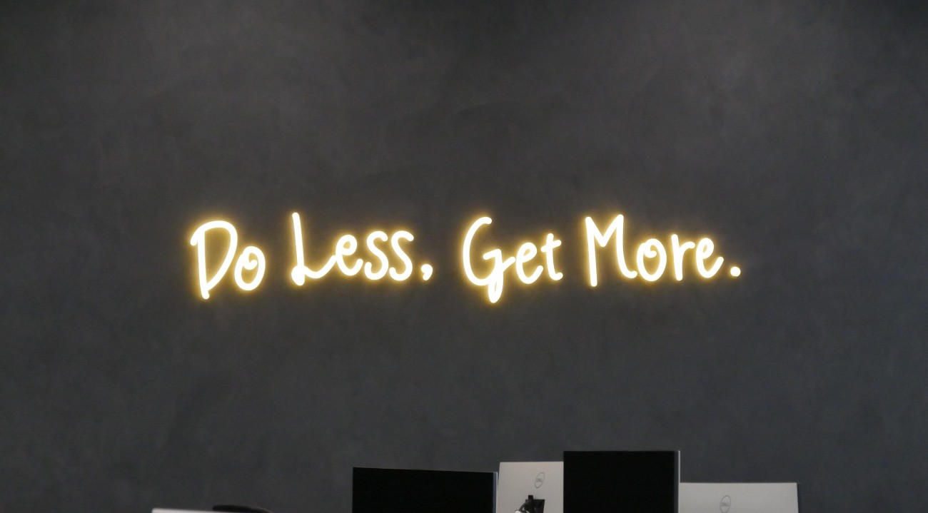また、執務室エリアの壁に飾られた「Do Less, Get More.」(少ない労力で、より多くの成果を)という言葉に目が留まる。開放感のある空間でありながら、社員の襟を正すような緊張感をも感じさせるこの文字は、渡久地氏の手書き文字をそのままネオン管にしたものだという。