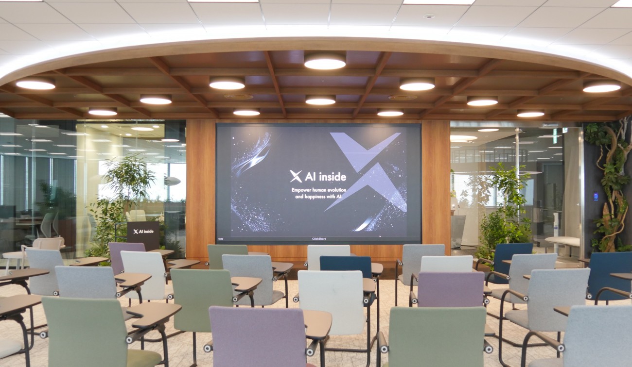 そのほか、CXラウンジという社内イベントやAI inside製品の体験場として機能するスペースも設置されている。ラウンジには巨大なモニターが置かれており、天井高が3mほどあるオフィスの特徴を生かした設計だ。「顧客体験価値の向上」という同社の目標を達成すべく、今後は“AIと共に創る未来”を検証・体験できるスペースへ発展させていく予定だという。
