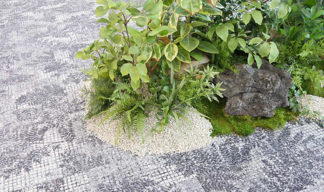 また、リラックススペースや執務室が広がるメインフロアの絨毯にはシダ柄の模様が描かれており、観葉植物も幅広く設置されている。
