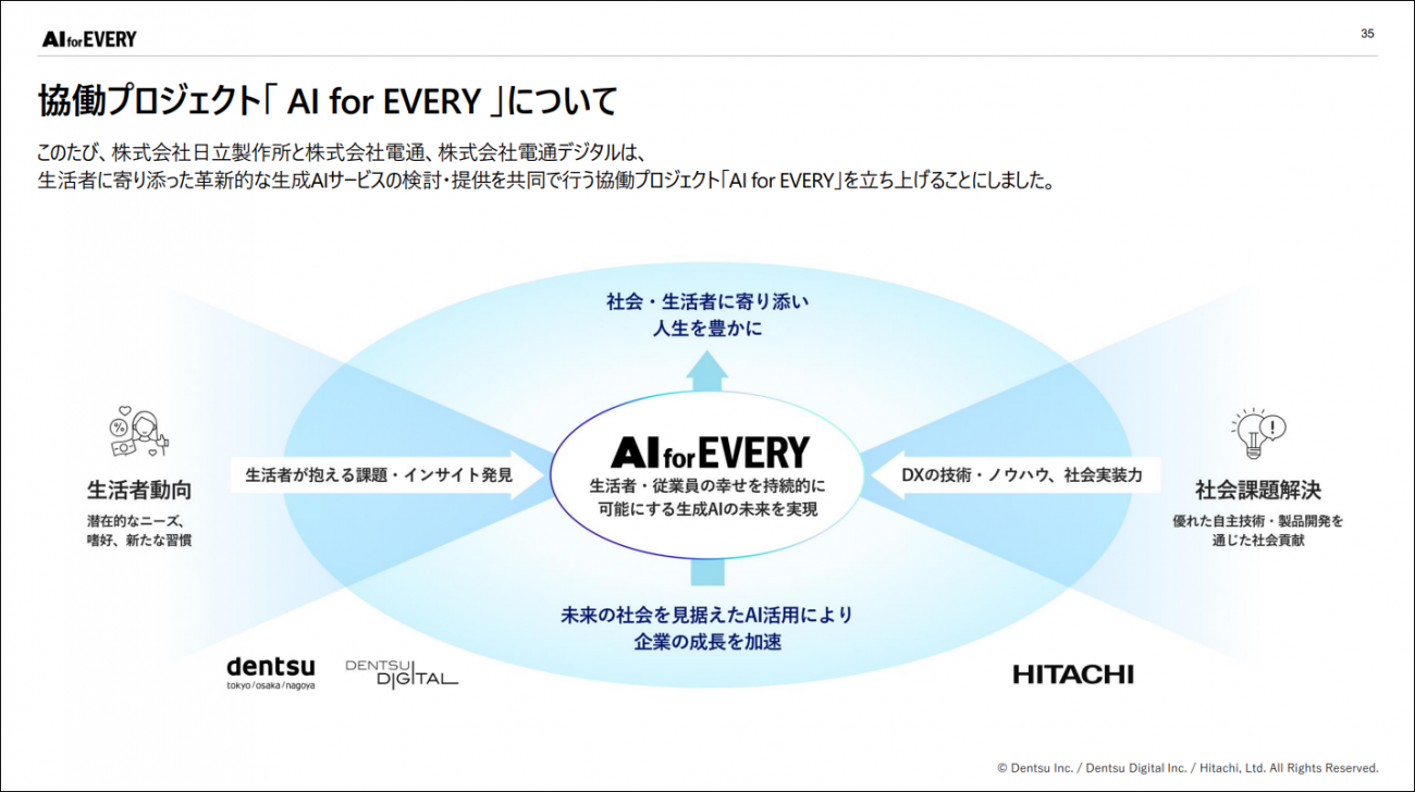 今回の協業により、3社は共同プロジェクト「AI for EVERY」を始動。同プロジェクトは、3社のAI技術の開発・活用における専門性を生かして、生活者に寄り添った生成AIサービスの検討・提供を行うものだという。