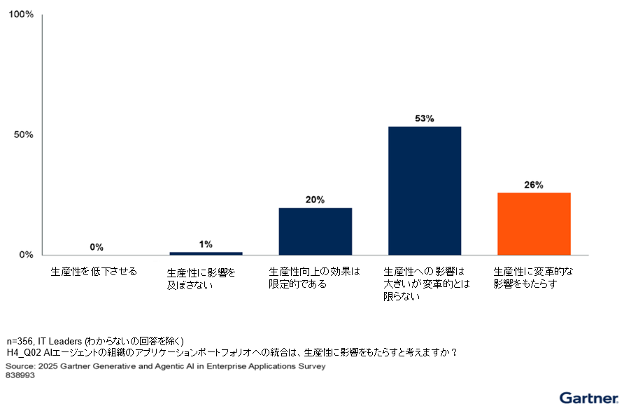 回答者の26%は、AIエージェントが生産性に変革的な影響をもたらすと感じている一方、過半数(53%)は「影響は大きいが変革的とは限らない」と回答し、20%は生産性向上の効果は限定的である」と回答している。