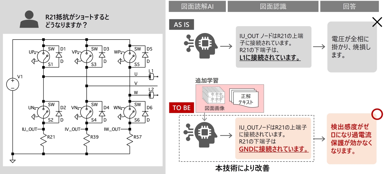 同技術は、図面画像と接続関係テキストをペアで追加学習させる独自手法により、電子回路図の接続関係認識精度を従来比で約220%向上させることに成功したという。これにより、従来生成AIが苦手としていた複雑な機器間の接続関係も正確に認識でき、現場に眠る図面から現場ナレッジをデジタル化することが可能だとしている。