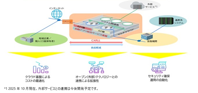 - 開発・運用負担の軽減:クラウドの運用および提供アプリケーション開発は同社が担当するため、地域金融機関や企業はハードウェア・ソフトウェアの調達・開発にかかる作業の負担を最小限に抑えられるとしている。なお、各金融機関側のインターフェース部分や個別のネットワークなどを除くという