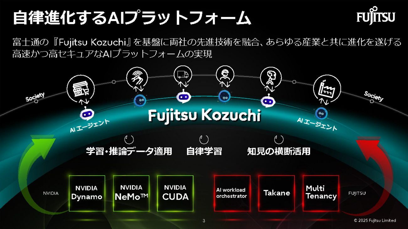 富士通のAIプラットフォームである「Fujitsu Kozuchi」を基盤に、NVIDIAの技術群(Dynamo、NeMo、CUDA)を統合する。これにより、高いセキュリティとスピードを両立したAI Workload Orchestrator技術、およびマルチテナンシーを実現する。マハジャンCTOは、特に企業が活用を加速させるAIエージェントに着目し、NVIDIAのNeMoやNemotron、富士通のAIモデル「Takane」などを組み合わせたエージェントフレームワークを提供することで、顧客のニーズに合わせたスピーディーな導入を可能にする、と説明した。
