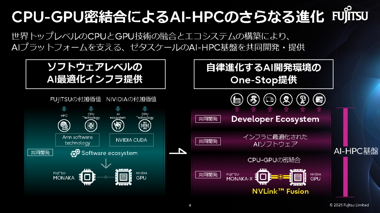 高性能と省電力を両立する富士通のCPU「FUJITSU-MONAKA」シリーズと、NVIDIAの高性能GPUを組み合わせ、シリコンレベルから共同で最適なインフラ開発を行う。NVIDIAのフアンCEOは、MONAKAが「NVLink Fusion」と呼ばれる高速なインターコネクト技術を用いてNVIDIAのGPUと融合されることで、「エネルギー効率が高く、高性能な新しいクラスのコンピューティングシステムを生み出す」と説明した。この取り組みは、理化学研究所が主導する次世代フラッグシップスーパーコンピュータ「富岳NEXT」プロジェクトを推進力としつつ、様々な産業への汎用的な提供を目指す。マハジャンCTOは、「AIプラットフォームとコンピューティングプラットフォームを合わせて、お客様にソリューションを提供していきたい」と述べ、AIとそれを支える演算基盤の不可分な関係性を強調した。