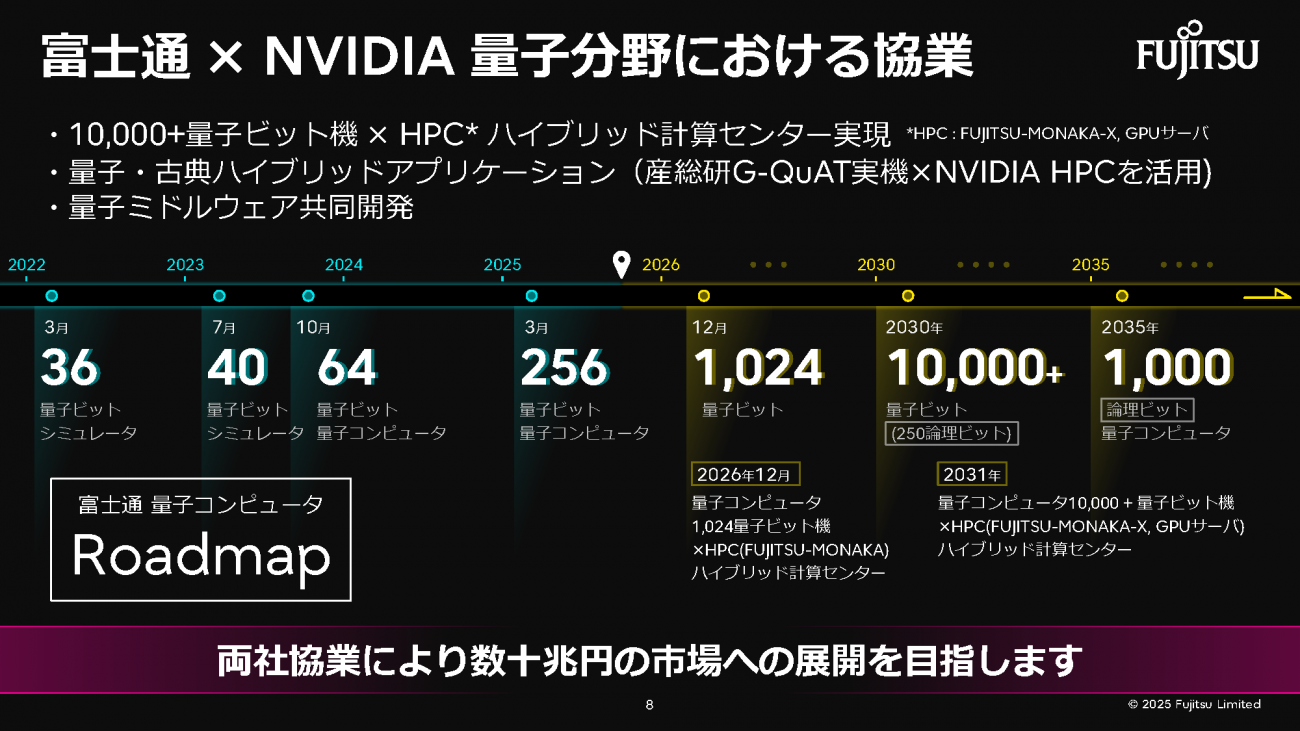 今回の発表で特に注目すべきは、AIインフラの拡張が量子コンピューティングの領域にまで射程に入れている点だ。時田社長は、AI駆動社会を支えるインフラとして量子コンピュータが不可欠であるとし、富士通が2026年に1,024量子ビットの量子コンピュータ開発を目指していると明かした。「将来的にこの量子コンピューティングの領域においても、両社の掛け合わせた取り組みによって、社会への貢献を果たせるものと確信している」と述べる。