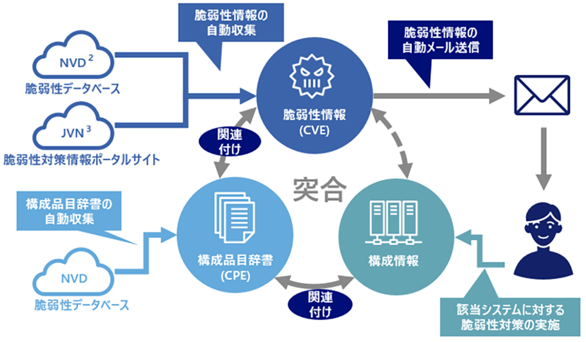 (図1)脆弱性情報・構成品目辞書・構成情報の自動突合と担当者への自動通知のフロー