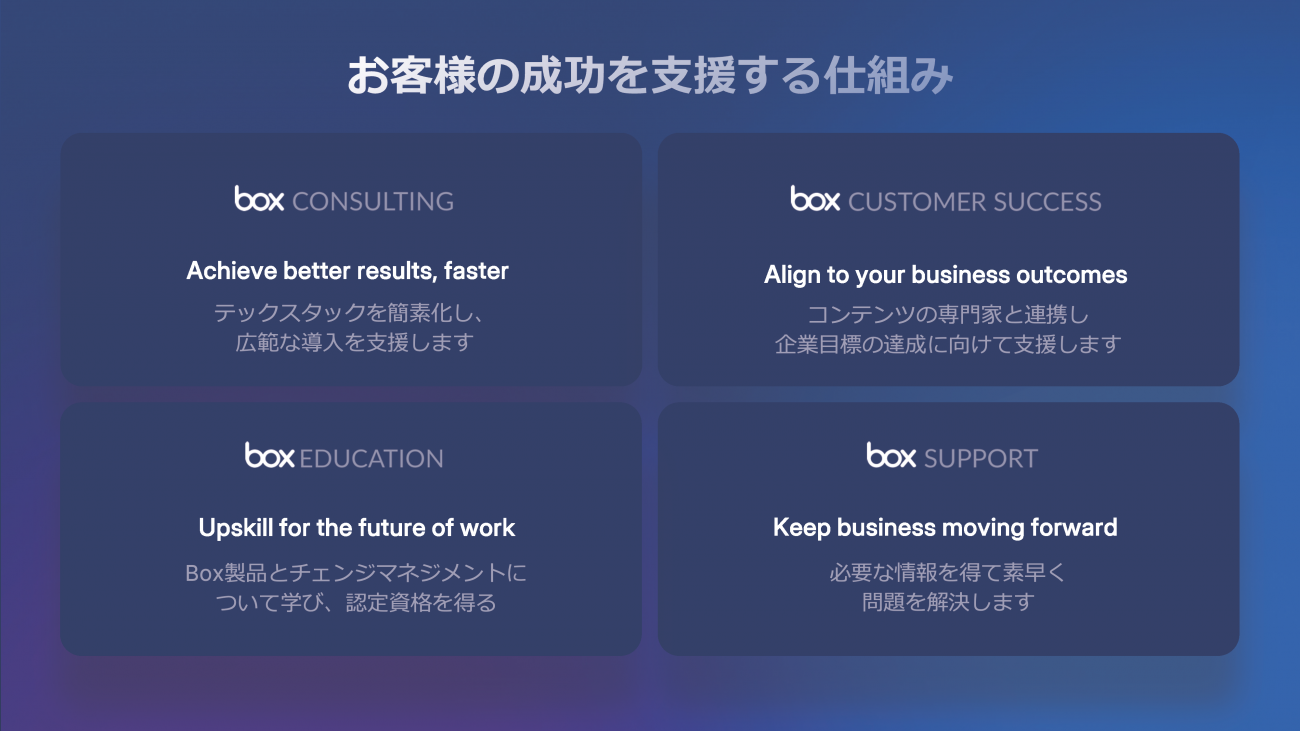 さらに、ユーザーがBoxをより効果的に活用できるようにサポートする人的支援サービスも提供しているとして、下図が示された。