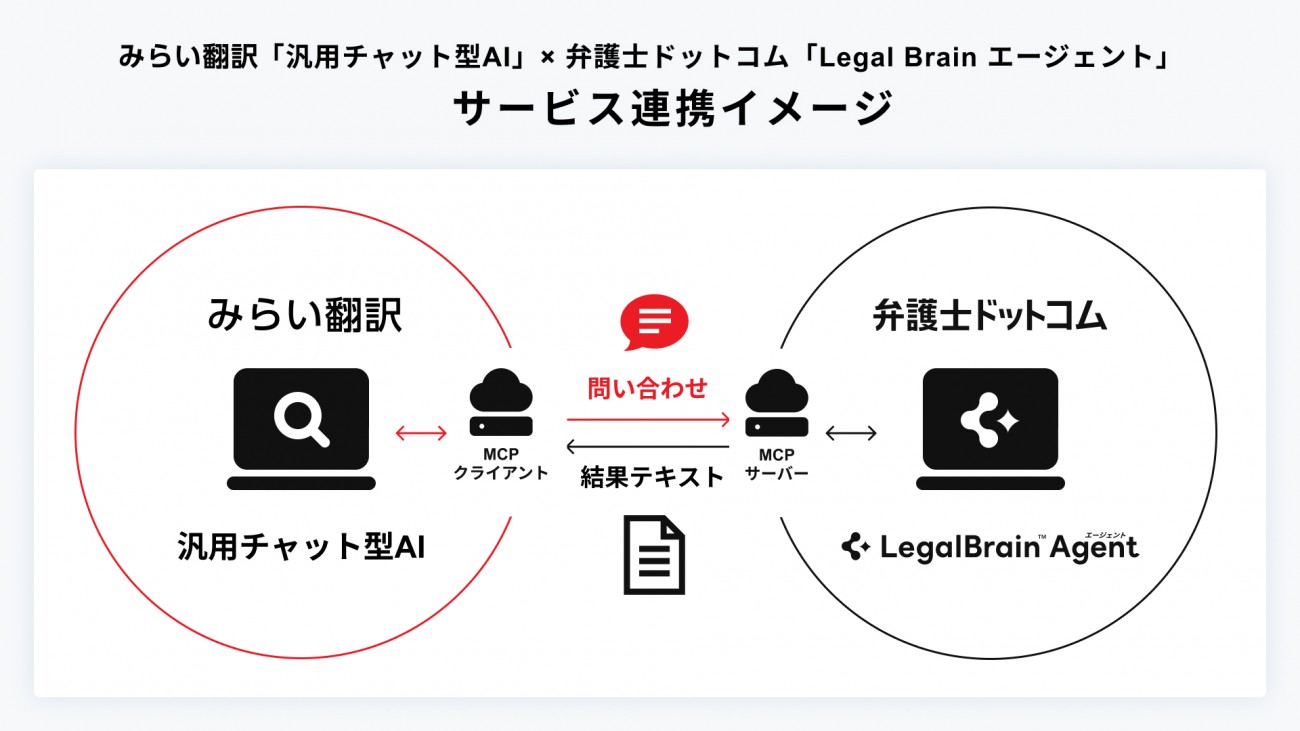 同実証実験では、MCPを活用し、みらい翻訳が開発する汎用チャット型AIエージェントと、弁護士ドットコムのリーガル特化型AIエージェント「Legal Brainエージェント」を連携させ、実際の法務業務のユーザー体験が向上し、生産性が向上するかを検証するという。