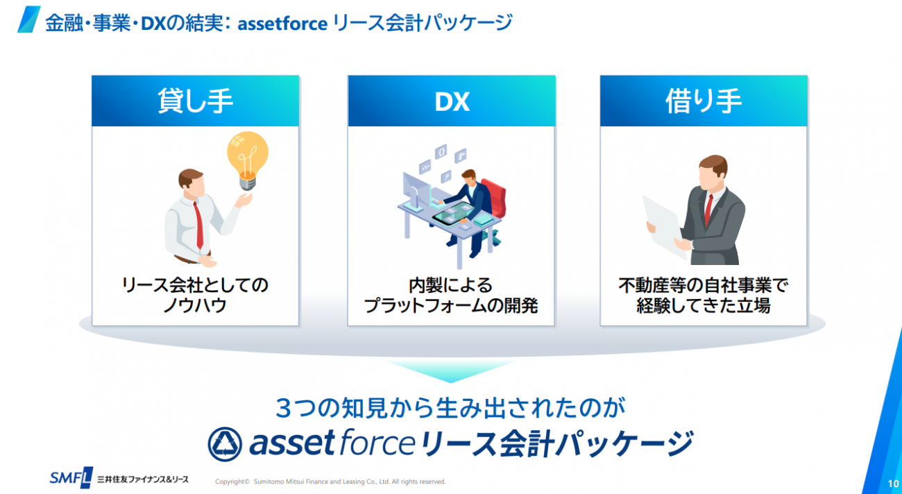 三井住友ファイナンス&リース(以下、SMFL)は、2027年4月以降に始まる会計年度から適用される「新リース会計基準」への対応を支援するパッケージ「assetforce リース会計パッケージ」を正式に販売開始した。