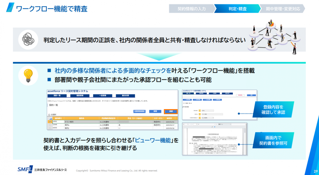 先述したビューワー機能もここで活きてくる。「判断の根拠を後続の担当者へと確実に引き継いでいくことが可能となるため、新リース会計基準の下でも対応できる契約の管理体制を構築できる」と縄野氏は語った。