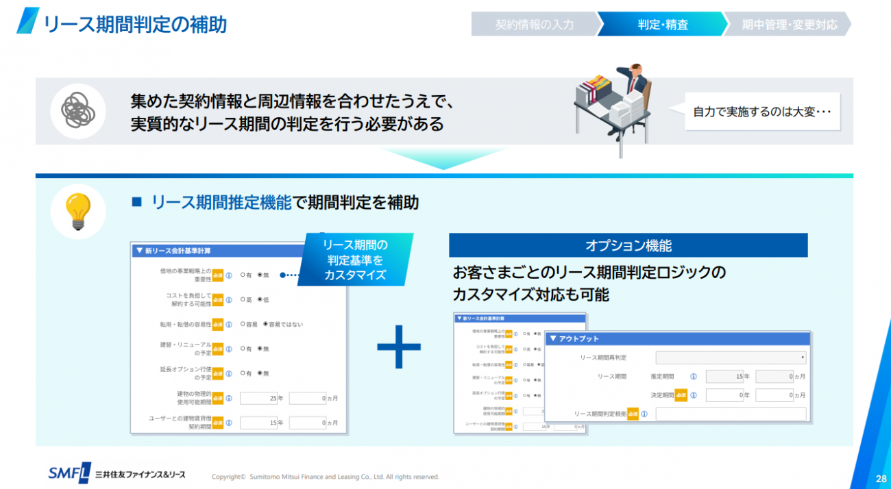 そこで同パッケージに標準搭載されているのが、契約情報からリース期間を推定する機能だ。ユーザーごとのリース期間判定ロジックに合わせたカスタマイズを行うこともできる。入力から精査・承認までの一連の流れをつなぐことも可能だという。「判定の根拠を可視化し、属人性を排除して、誰でも確認できるプロセスを実現する」と縄野氏は説明する。
