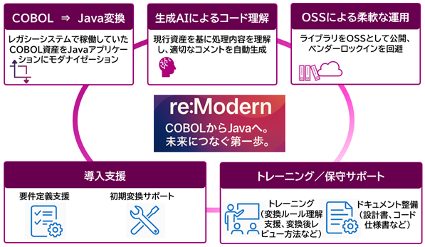 re:Modernは、COBOLで構築されたレガシー資産をJavaへ自動変換するサービス。変換結果の有効性と作業効率を向上させる施策として、生成AIを用いて、既存の設計書やプログラムから、処理内容を理解し、適切なコメントを変換後のコードに自動反映する機能も備えているという。COBOLの専門知識がない開発者でも、既存システムの処理内容を把握しやすくなり、属人化の解消に加え、システムの新旧比較やJava開発者による旧システムの理解支援など、リビルド(既存システムを参考に再構築する開発手法)時の活用にもつながるとしている。