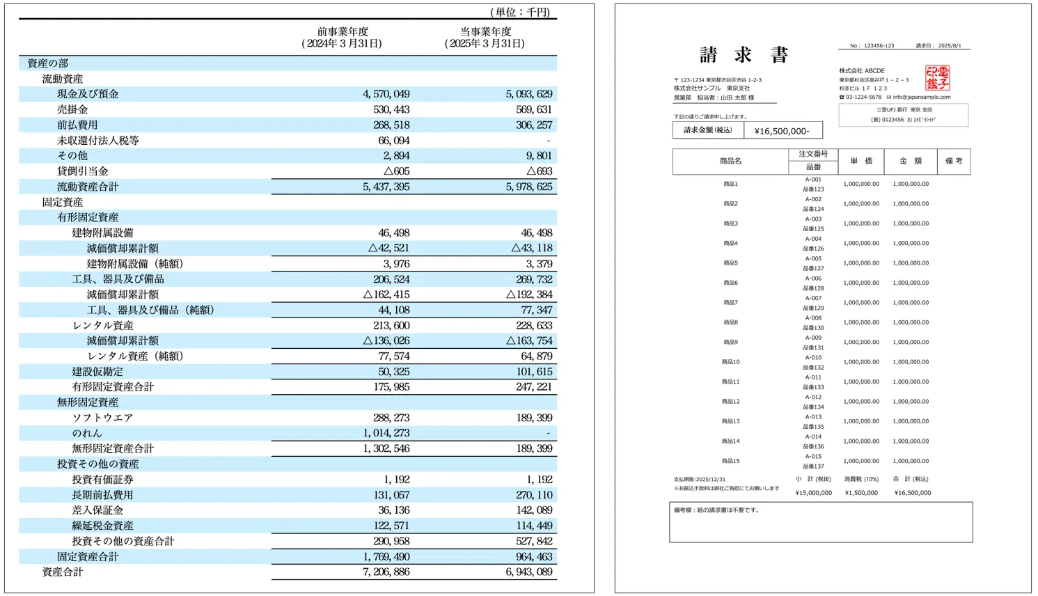 たとえば、長大な表を含む有価証券報告書、階層が分かれている財務諸表、複雑な形式の請求書・見積書をはじめ、けい線がなく明細項目が複数行にまたがる診療明細書、残高証明書・証券口座一覧表など、複数表が混在するマルチテーブル帳票にも対応。また、旧漢字を含む原戸籍、欄外に手書きメモがあるタイムカード、自治体ごとに書式や構造が異なる課税証明書、動画から抽出した車両ナンバープレート、輸出入コンテナ番号の写真など、形式や内容が異なる帳票や画像データも読み取れるとしている。