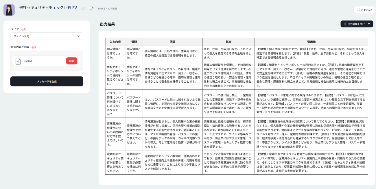 情シス業務を逼迫させるセキュリティチェック関連の業務は、正確さを求められる労力のかかる作業にも関わらず、情シスの貢献が可視化されにくい業務のひとつ。たとえば、新たに導入するITツールが自社のセキュリティ基準を満たしているかを、情シスが「セキュリティチェックシート」と呼ばれるフォーマットをもとに照合する作業があるという。天才くんfor情シスに搭載された「自社セキュリティ基準照合さん」や「他社セキュリティチェック回答さん」は、このセキュリティチェックを情シスに代わり基準にのっとって実施。また、「情シス問い合わせくん」は、現場からの一次問い合わせなどに代理対応するなど、情シスのジレンマを生成AIによって取り除くとしている。
