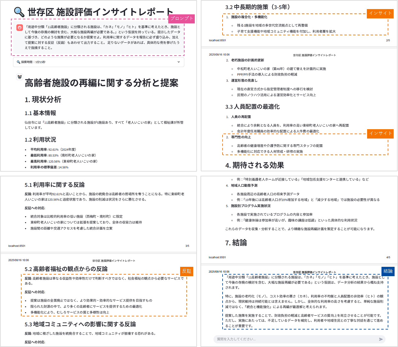 次のインサイトレポートの例では、「高齢者施設」をテーマに、大幅な施設再編が必要との仮説をもとにして、データに基づいた定量的な分析と必要な施策の提案、およびその提案に対する反証(反論)を含めて分析するよう生成AIに対しプロンプト指示を行っているという。