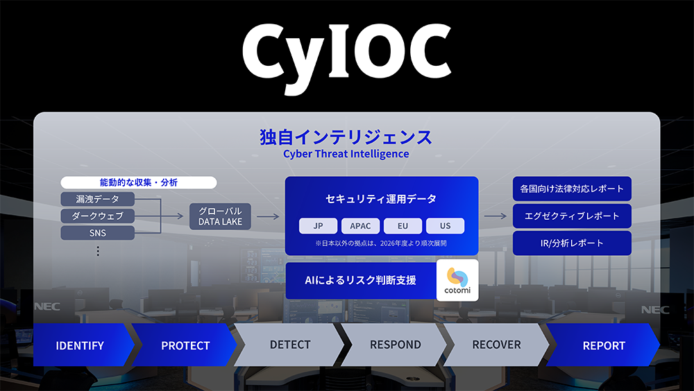 NECは、独自のインテリジェンスとAI技術を融合した次世代サイバーセキュリティサービス「CyIOC(サイオック)」を新ブランドとして提供開始すると発表した。