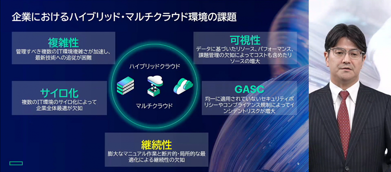 さらに、IT環境のサイロ化、組織全体における最適化の欠如が深刻化している現状にも触れる。この結果として、データに基づいたリソースやパフォーマンスの管理ができずコストが増大するだけでなく、セキュリティポリシーやコンプライアンス規制が均一に適用されないことによるインシデントリスクの増大も招いている。挾間氏は、「局所的な対応や、その都度の手作業では、膨大なマニュアル作業が相まって最適化の継続性を欠くことになる」として、“継続的な最適化”が真のハイブリッドマルチクラウド環境をデザインする上で重要な要素であると強調する。