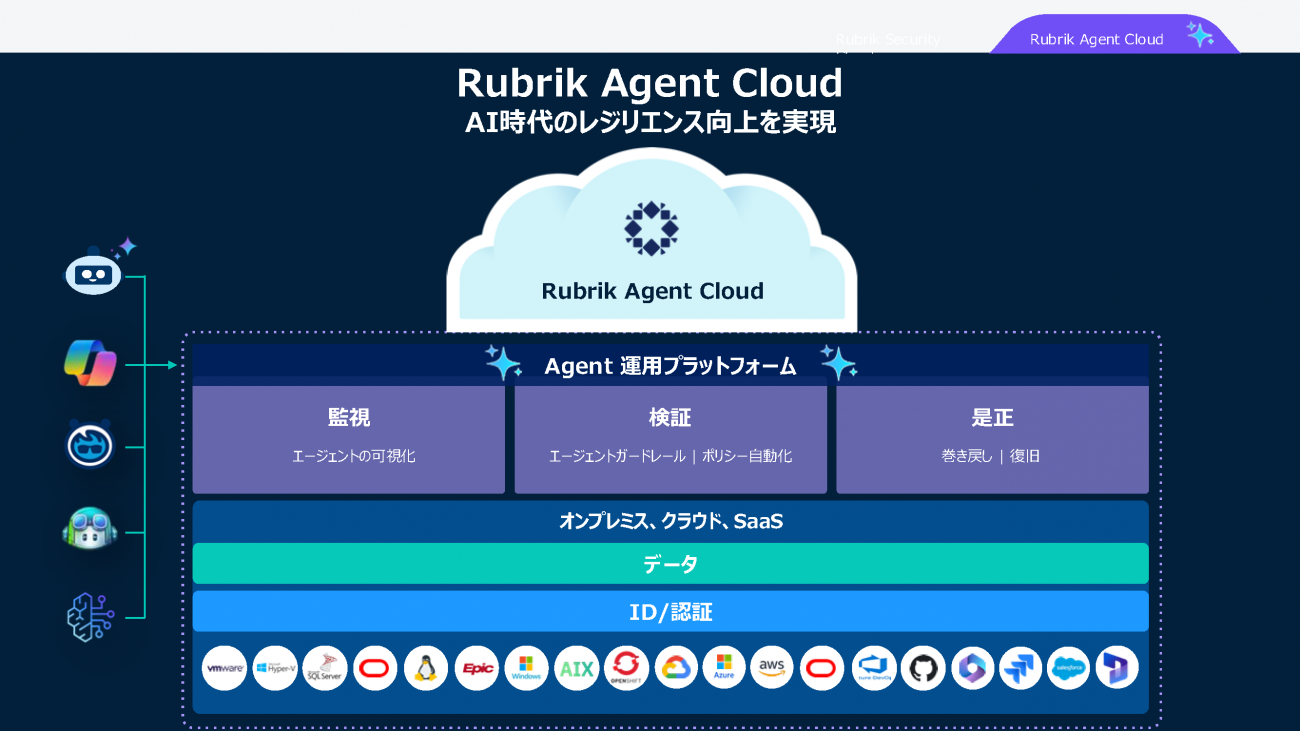 Rubrik Japanは11月26日、企業のAIエージェント運用における統合コントロールレイヤーとなる新ソリューション「Rubrik Agent Cloud」に関する記者説明会を開催した。同ソリューションは、AIエージェントがもたらす革新とともに、その誤動作や悪用によるリスクに対応するため、「監視」「ガバナンス」「修復」の3つを核とし、AIの安心・安全な活用を支援するものだという。
