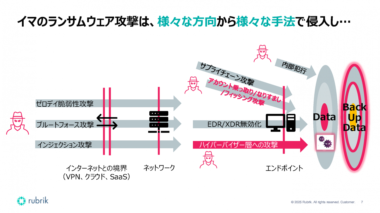 一方で、サイバー攻撃の傾向は変化している。昨年まで仮想化ソフトウェアの脆弱性を突いたハイパーバイザー層への攻撃が多かったのに対し、2025年はフィッシングメールなどによる「正規アカウントの乗っ取り」が増加しているという。ハッキングではなく正規のログインとなるため、侵入に気づくことが極めて難しくなっていると指摘した。