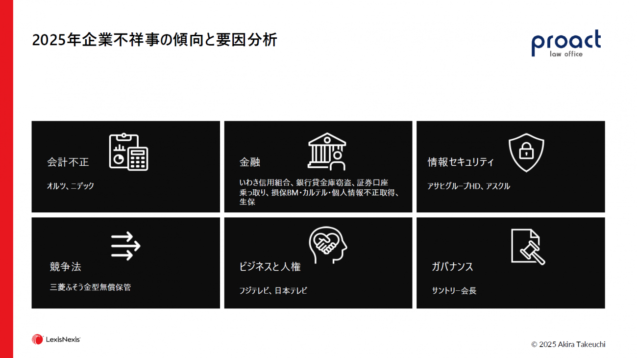 竹内氏は、今年に起こった企業不祥事の傾向と要因分析について、「会計不正」「金融」「情報セキュリティ」「競争法」「ビジネスと人権」「ガバナンス」という6つの観点から注目トピックを説明した。