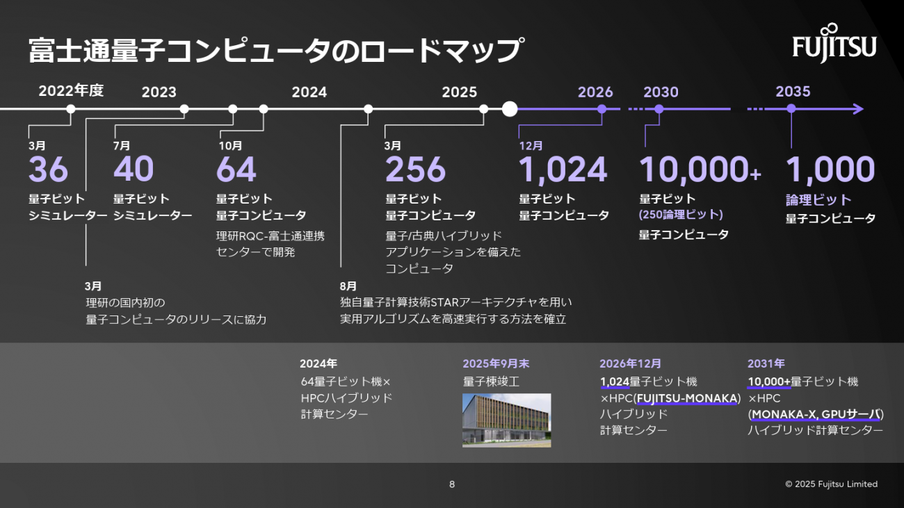 量子コンピューティング領域においては、世界最大級となる1024量子ビット超伝導量子コンピュータの開発を進め、2026年12月に発表予定だという。Fujitsu Technology Parkの敷地内に量子棟を作り、そこで稼働させる見通しだ。加えて、MONAKAとの量子HPCハイブリッド環境を作ることで、量子技術実証のテストベッドとして幅広く活用する予定だとしている。