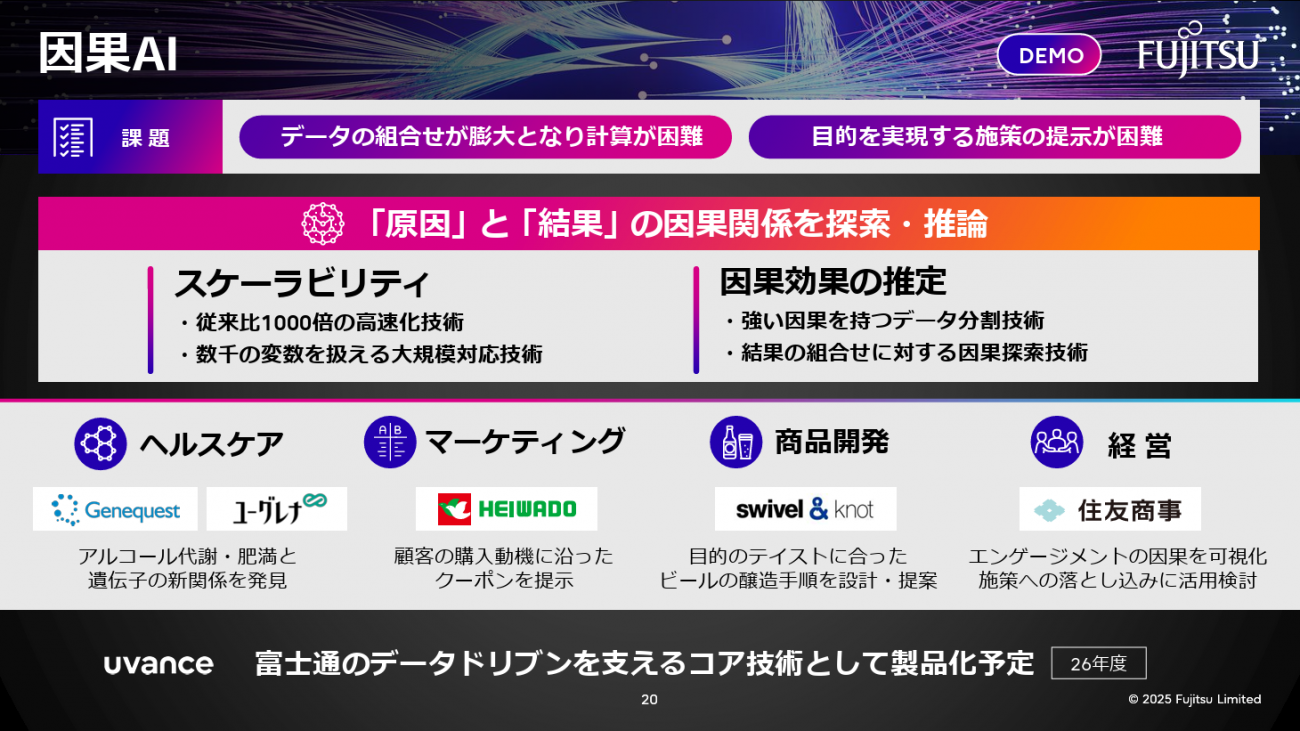 また、物事の「原因」と「結果」の因果関係を探索・推論する「因果AI」に関する研究を進めており、2026年度に製品化予定とのことだ。