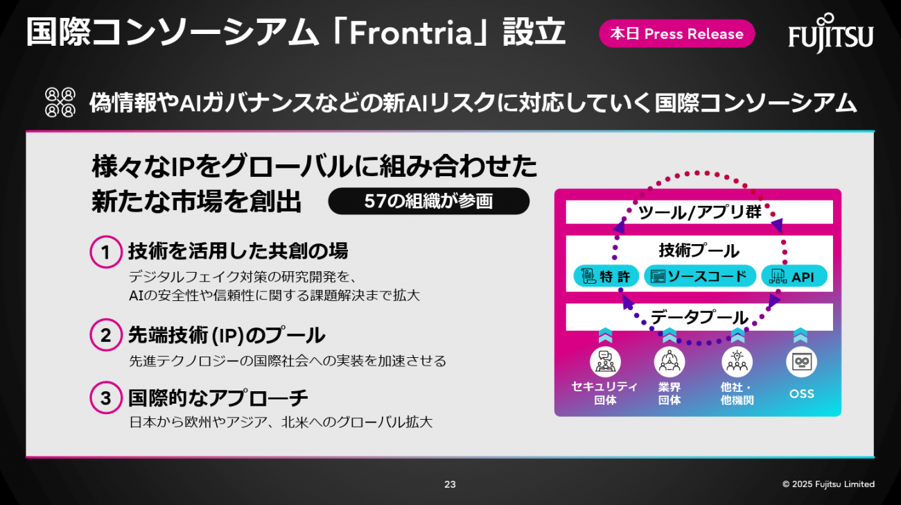 そのほか、新たに偽情報やガバナンスといったAIのリスクに対応するための国際コンソーシアム「Frontria」が設立された。現時点で57の組織が参画しており、同社は金銭要求や本人詐称などのリスクに対応するフェイク検知、AIによる差別的な判断のリスクに対応するAIの公平性など、偽・誤情報対策、AIトラスト、AIセキュリティ領域のコア技術を参画組織に対してトライアル提供するとのことだ。